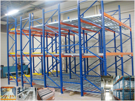 ¡¡ on the shelf is equipped with roller device, the slope is about 3 degrees ,in the use of self-FIFO goods for the same goods in large quantities, very high space utilization, a single pallet of goods is normally less than 1000kg, the middle can be damping configuration gun barrel in order to reduce the rate of decline in the tray.